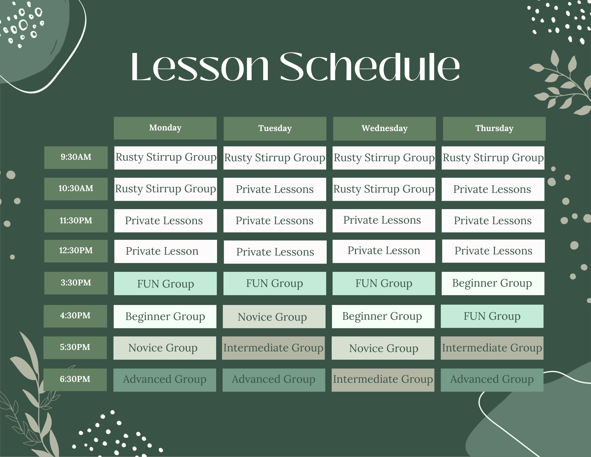 If you are interested in joining our group lessons during any session please fill out the below form with your preferred group times. We will contact you with confirmation of group registration.